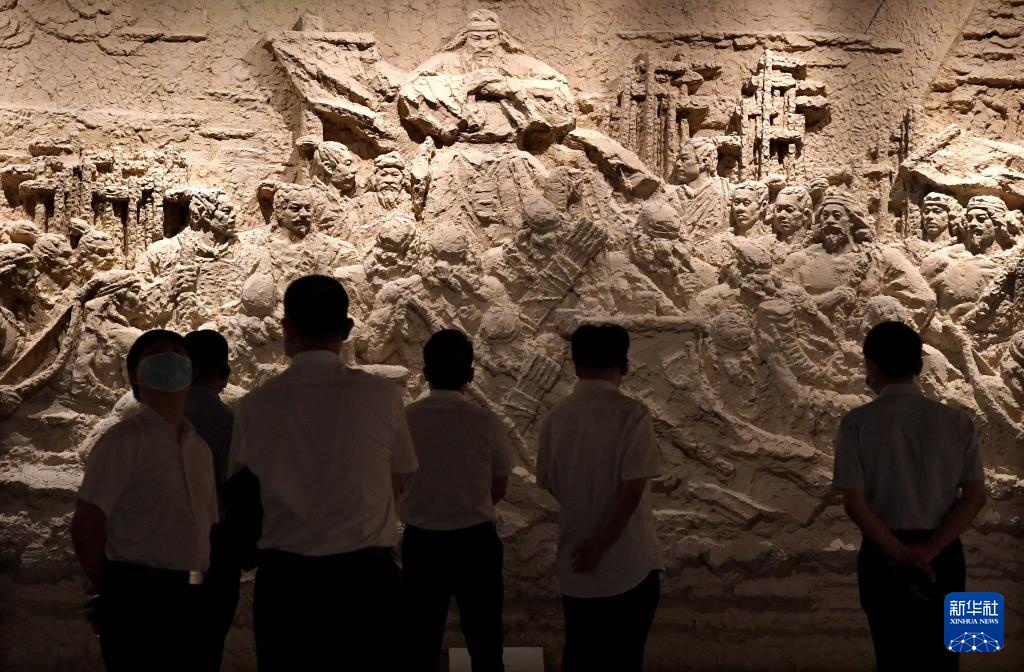 7月26日,参观者在郑州商都遗址博物院内观看浮雕。