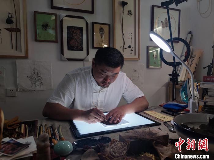 在雕刻技艺上,李昊并不拘泥于传统技法。他告诉记者,传统技法是先制出要雕刻内容的模板,再将树叶贴于模板上,放于水中雕刻。