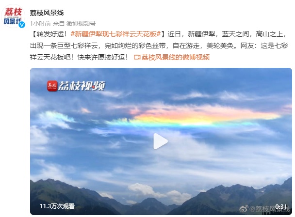 【转发好运!新疆伊犁现七彩祥云天花板】近日,新疆伊犁,蓝天之间,高山之上,出现一条巨型七彩祥云,宛如绚烂的彩色丝带,自在游走,美轮美奂。网友:这是七彩祥云天花板吧!快来许愿接好运!