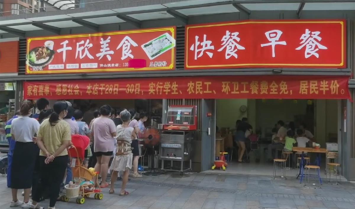 “家有喜事,感恩社会,本店于28-30日,实行学生、农民工、环卫工餐费全免,居民半价。”7月28日,广东佛山禅城区一家餐馆拉出的横幅引人注目。28日上午,老板邓先生告诉极目新闻记者,因为他的小儿子考上了清华大学,他决定与顾客们共同分享这一喜悦。