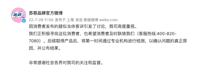 中新网7月28日电 苏菲品牌官方微博7月28日发布公告称,因消费者发布的疑似虫体客诉引发了讨论,苏菲高度重视。苏菲正积极寻找这位消费者,也希望消费者及时联络苏菲(客服热线:400-820-7080)。后续取得产品后,将第一时间通过专业机构进行检测,以确认问题的真正原因,并公布结果。