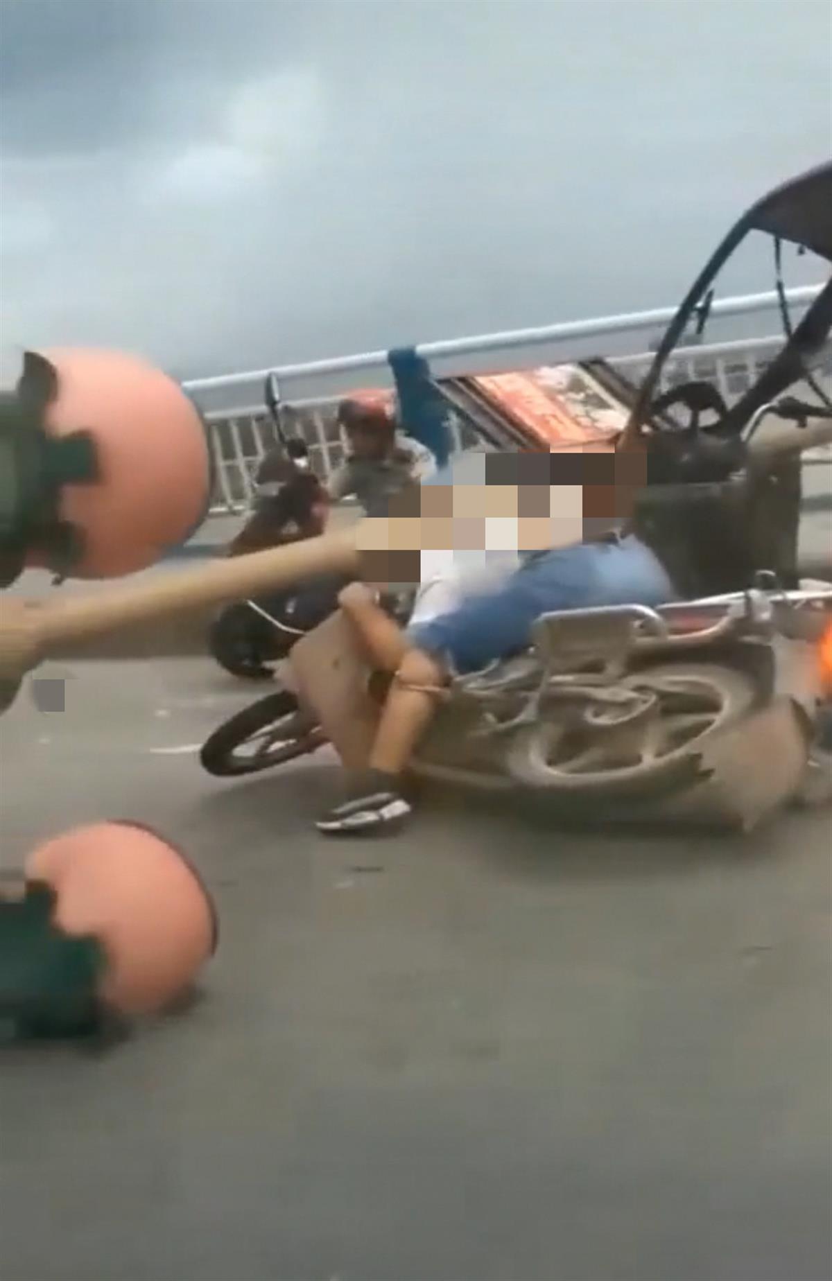 现场视频显示,拍摄者驱车缓慢行驶在桥面上,车窗外,有橘红色的路灯横着倒在桥面。一男子趴在斜着的摩托车上,与另一辆摩托车以及一辆三轮车一起,均被压在路灯灯杆下,男子看上去已经没有意识。