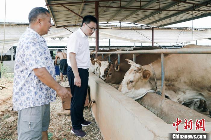 上高农商银行副行长游冬(右)查看肉牛养殖情况。 王昊阳 摄