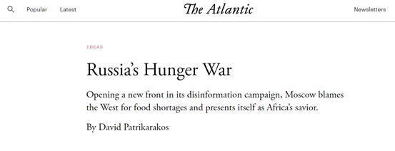 日前,美国《大西洋月刊》发表了一篇题为“俄罗斯的饥饿战争”的文章。文章说,“俄罗斯在社交平台上散布虚假信息,重点目标指向反西方情绪强烈的非洲等地区。这些信息是——西方对俄罗斯的制裁是造成粮食短缺的罪魁祸首”。