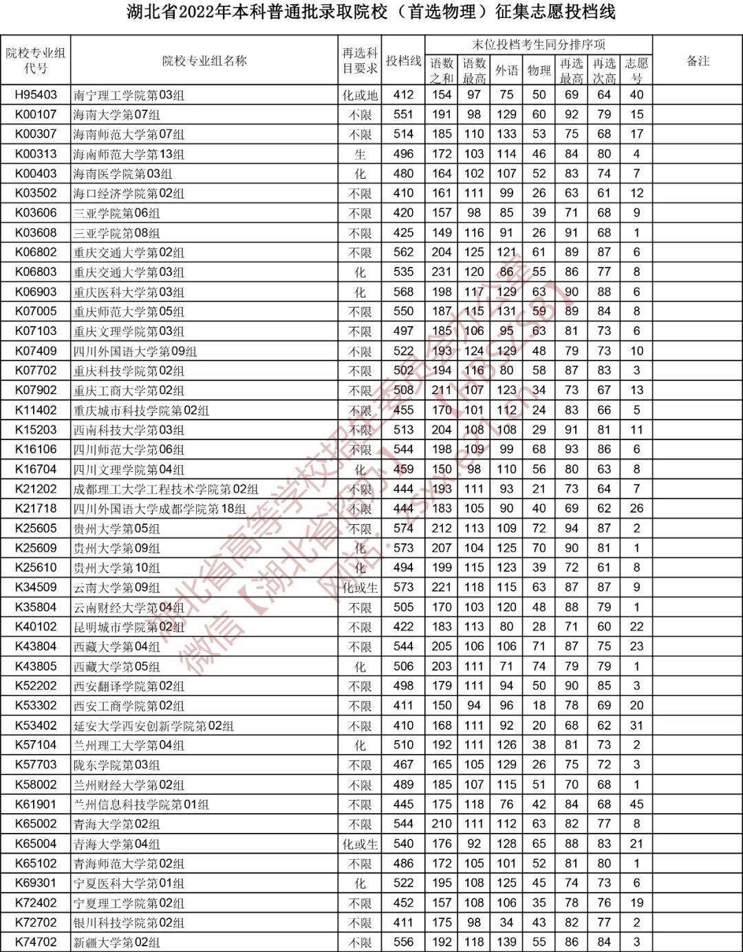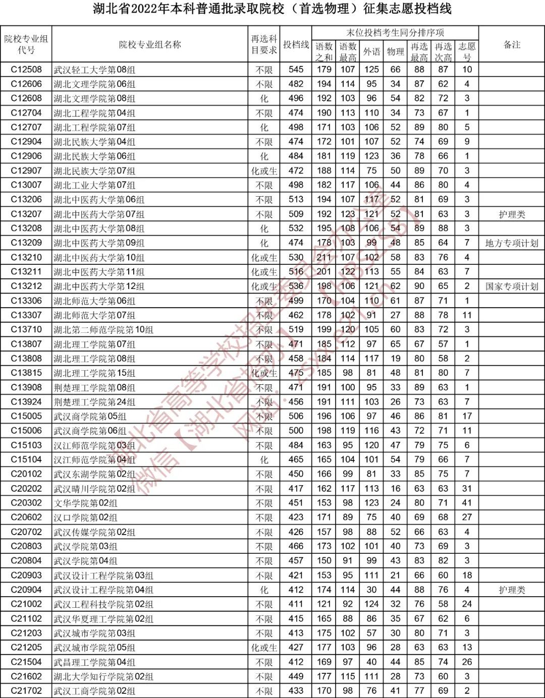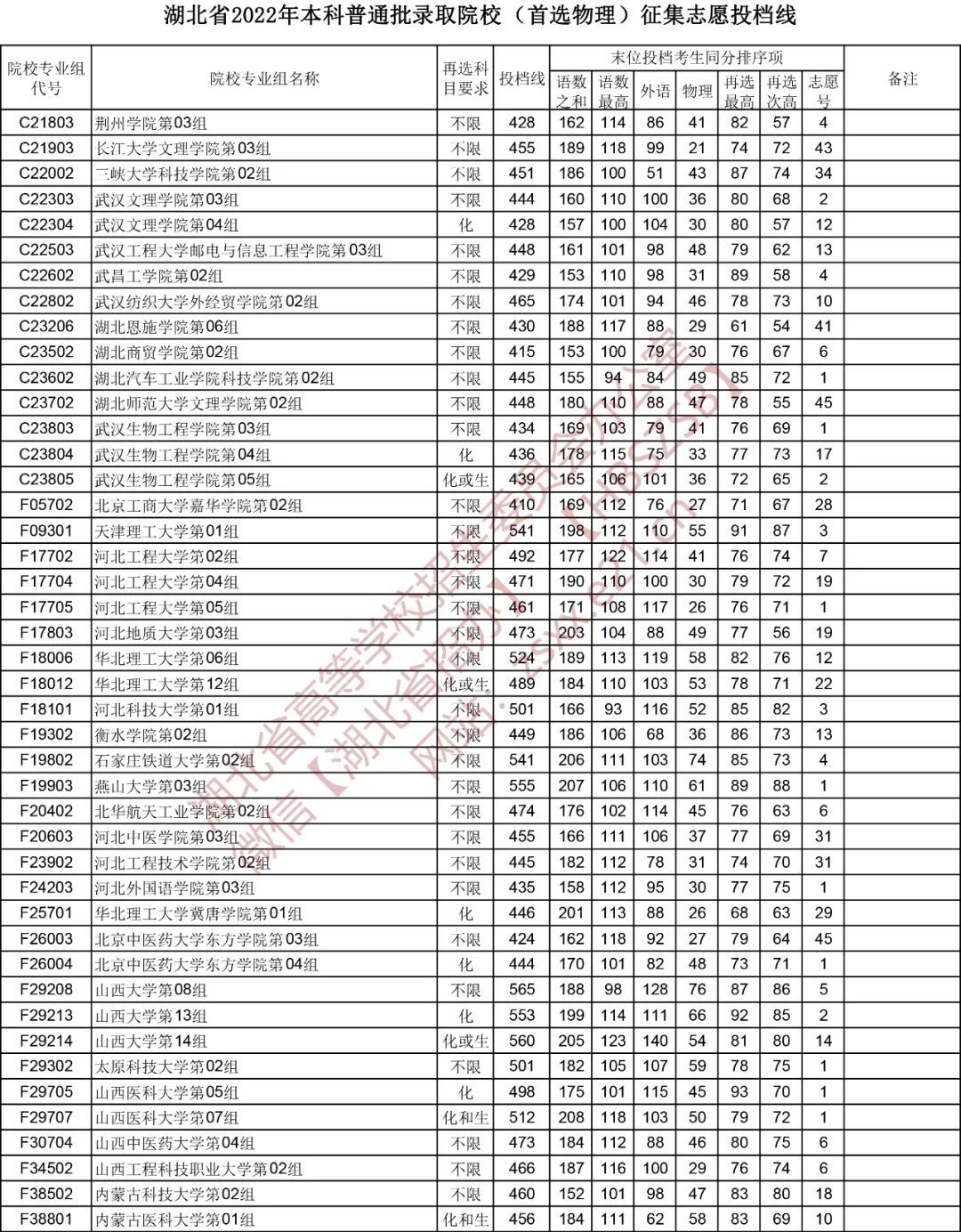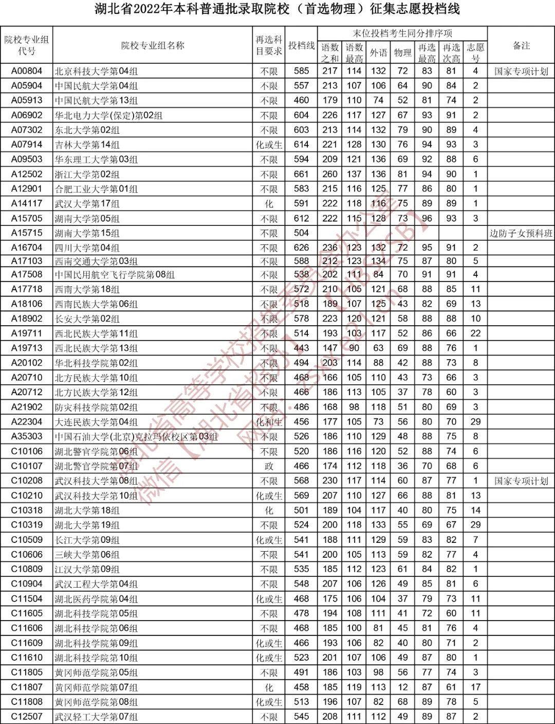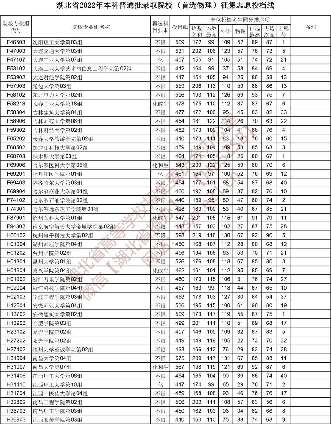 湖北省2022年本科普通批录取院校(首选物理)征集志愿投档线