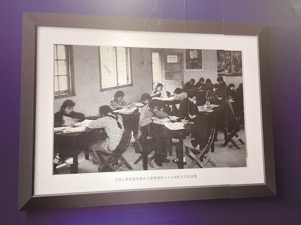 展出的历史图片中,一个满屋子女孩在桌前统计选票的画面令许多人驻足。祝希娟提到,当年百花奖的投票是观众一票票投出来的,“每一张选票背后不是一个人,而是一个工厂一个学校一个车间……”她回忆,在那个没有计算器的年代,百花奖组委会请来北京市女中的同学,用算盘一票票手工算出获奖情况,“所以我为什么总说,百花奖是对我们电影工作者最大的褒奖,因为这是人民给我们的奖,是观众给我们的奖,我们获的奖是特别真实的,没有猫腻”。