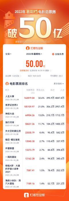 中新文娱北京7月30日电 据灯塔专业版,截至7月30日16时35分,2022暑期档(6月1日-8月31日)总票房50.00亿元(含预售),总场次1941.64万,总人次1.32亿。
