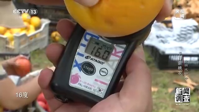 把一棵树按树尖、树围、树心的桃进行第一轮分类,每一类再按照大小颜色精细分为不同等级。专业的甜度测量后,大桃再按照不同等级进行包装。