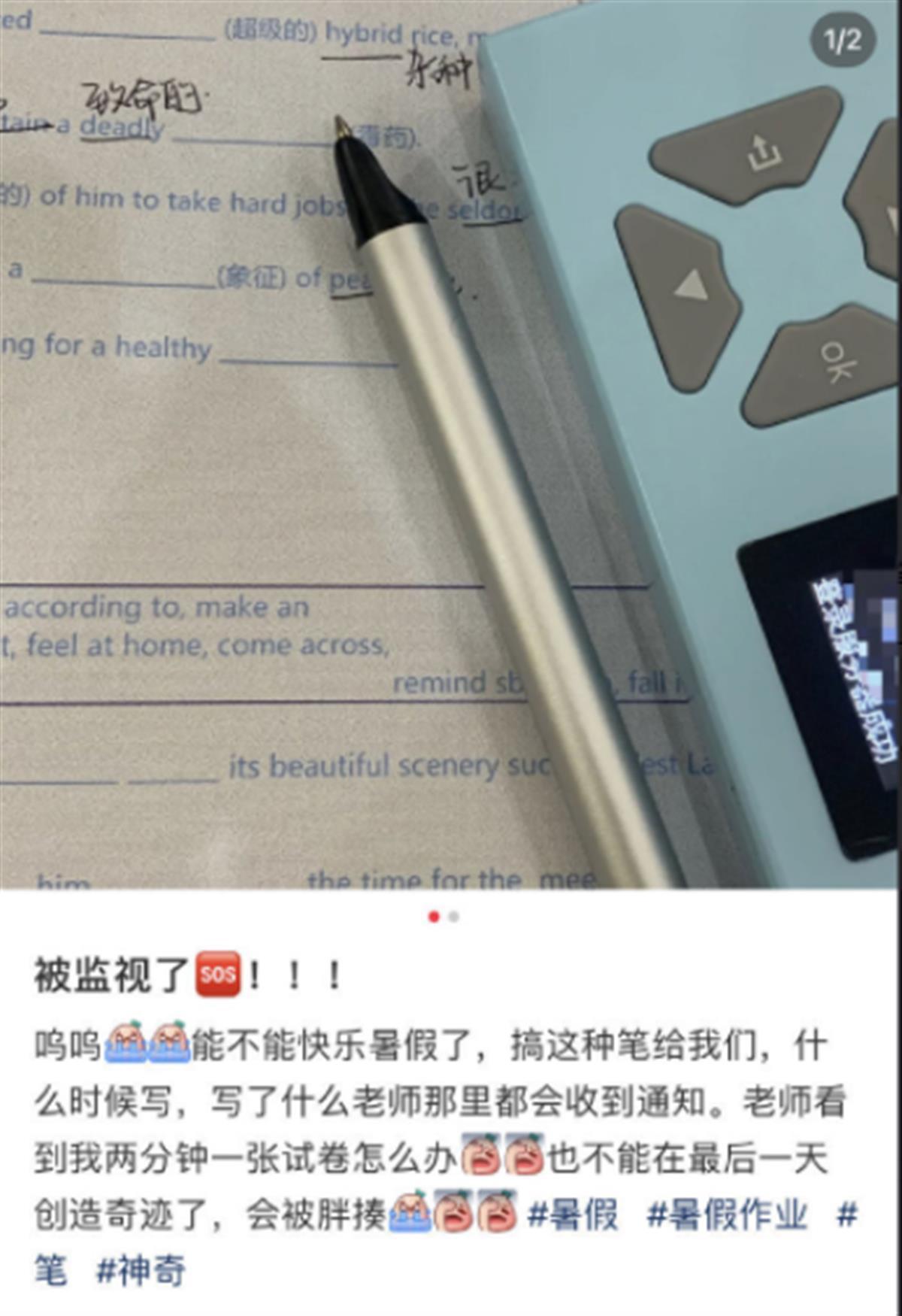 近日,有网友吐槽称,他们学校发放了一支暑假作业专用“智能笔”,作业什么时候写、写了什么内容,尽在老师的掌握之中。该网友称,感觉自己被监视了,并表示“暑假再也不能在最后一天创造奇迹了”。
