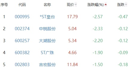 *ST皇台、中锐股份、大湖股份、ST广珠、吉宏股份位列涨幅榜后五位,涨幅分别为-2.57%、-2.33%、-2.20%、-1.90%和-1.50%。