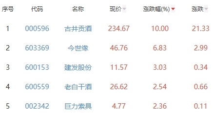 其中,古井贡酒、今世缘、建发股份、老白干酒、巨力索具位列板块涨幅前五位,涨幅分别为10.00%、6.83%、3.03%、2.54%、2.36%。