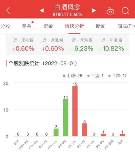 中国经济网北京8月1日讯 今日,白酒概念板块整体涨幅0.6%,其中26只股票上涨,1只股票平盘,17只股票下跌。
