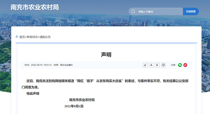 中新网8月1日电 8月1日晚,南充市农业农村局发布声明称,近日,我局关注到有网络媒体报道“网红‘提子’从京东购买大白鲨”的表述,与案件事实不符,有关结果以公安部门调查为准。