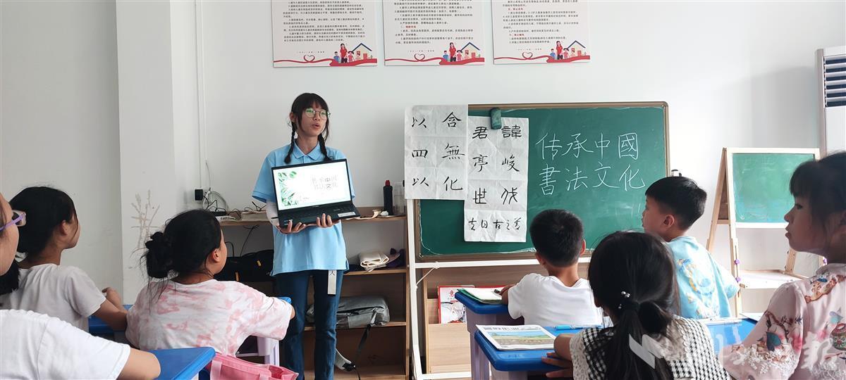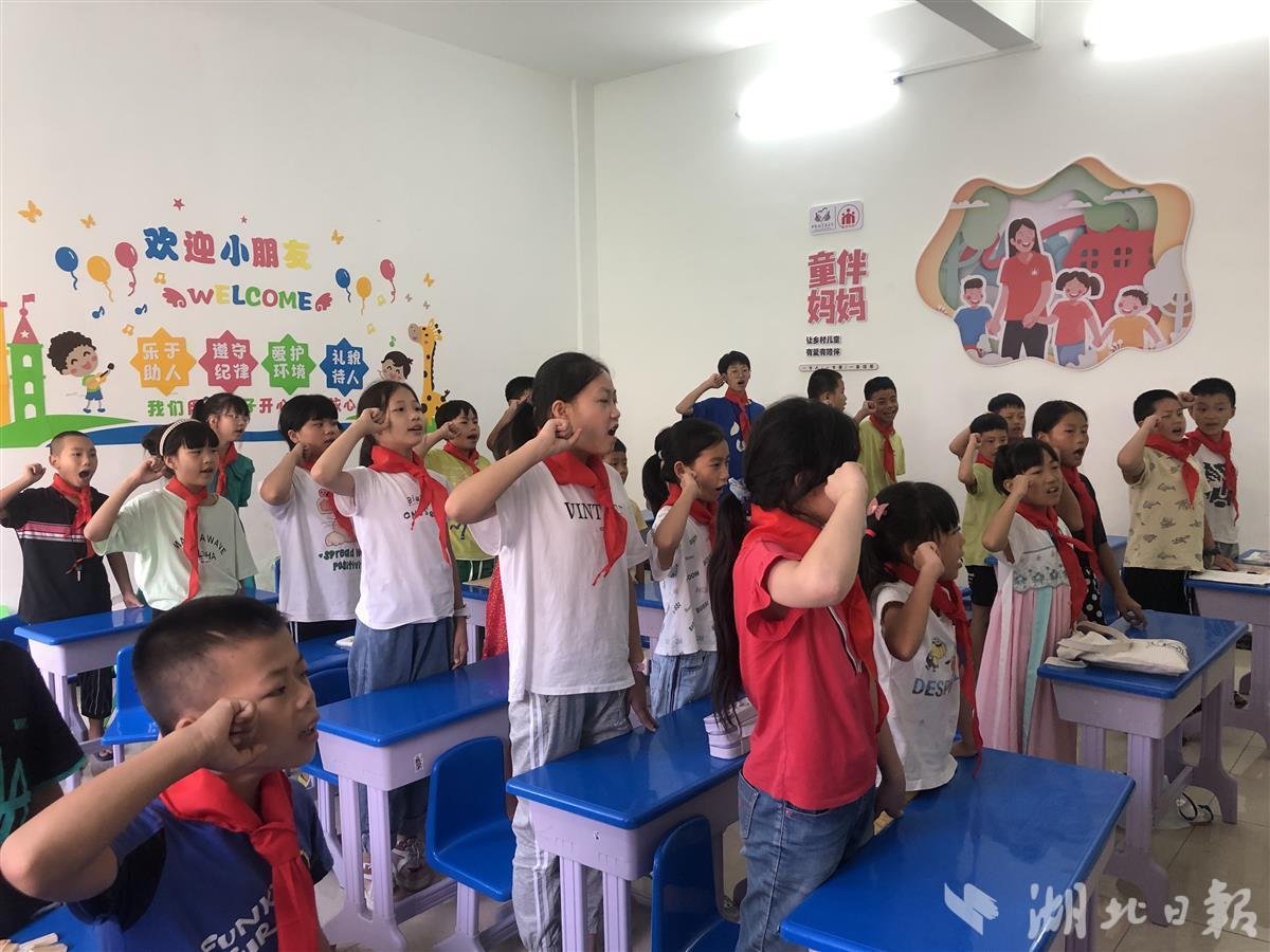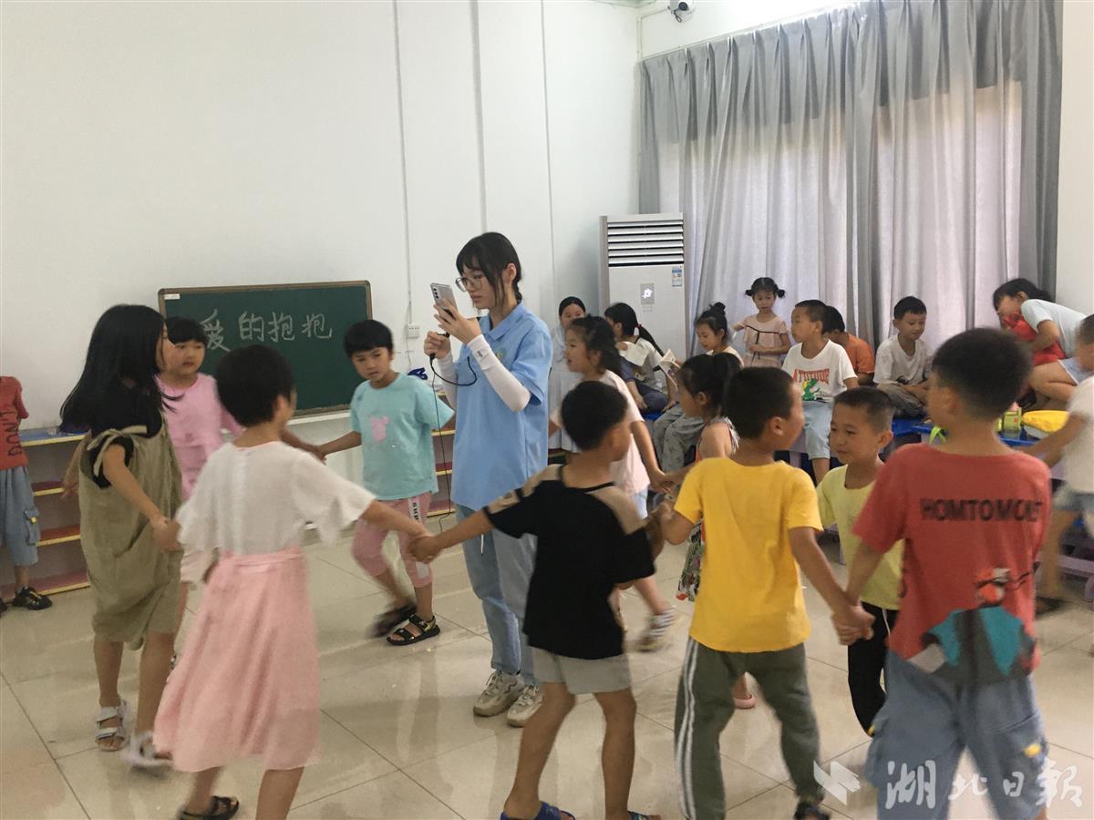 湖北日报讯(记者陈熹、通讯员刘腾飞、胡广京)“鲜艳红领巾,是国旗的一角,与国旗一样,都是由革命先辈的鲜血染红的!”8月2日,在恩施宣恩县李家河镇柚乡苑集中安置社区“四点半学堂”,湖北生物科技职业学院“润苗筑梦”支教团队员刘英卓正在给小朋友们讲解红领巾的意义。从7月中旬开始,该校10名志愿者,在当地开展为期一个月的支教助学活动,陪伴李家河镇塘坊村、柚乡苑社区160余名留守儿童共度暑期,其中,121名留守儿童来自脱贫户。