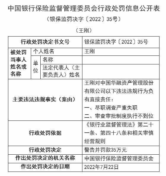 王刚对中国华融以下违法违规行为负有直接责任:一、尽职调查严重失职;二、审查审批制度执行不到位。中国银保监会依据《银行业监督管理法》第二十一条、第四十八条和相关审慎经营规则,对王刚警告并罚款35万元。