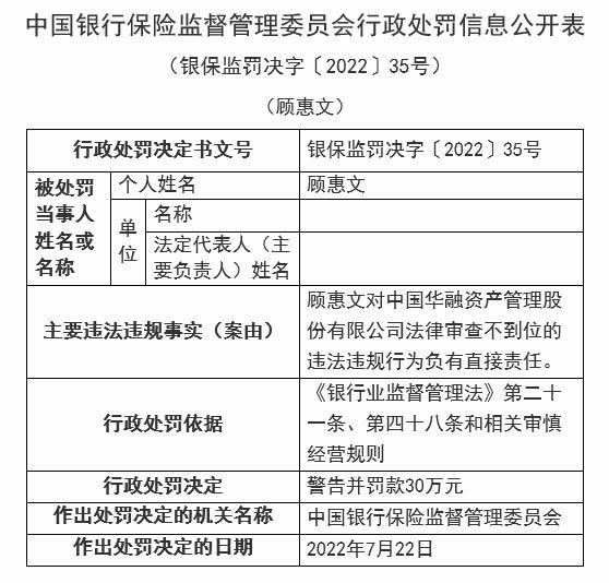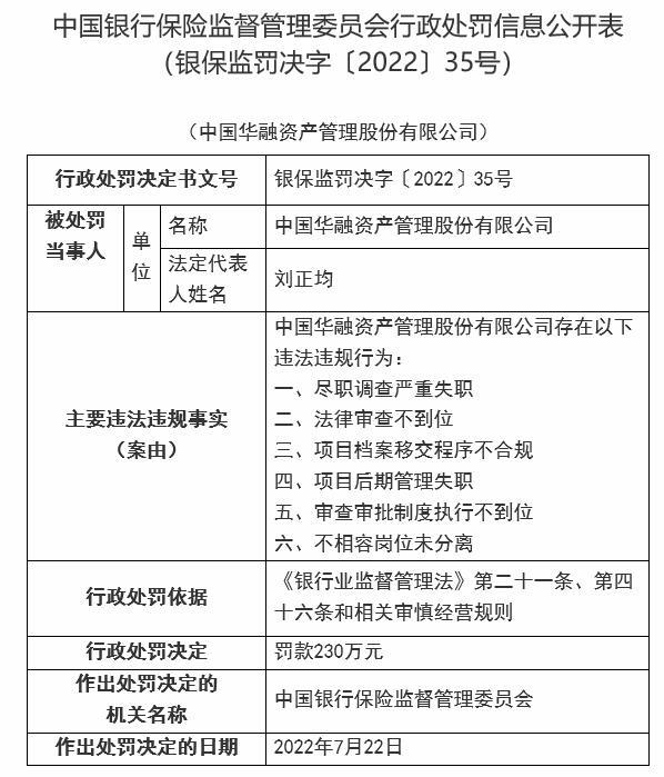 中国经济网北京8月3日讯 中国银保监会网站昨日公布的中国银行保险监督管理委员会行政处罚信息公开表(银保监罚决字〔2022〕35号)显示,中国华融资产管理股份有限公司(简称"中国华融",港股代码︰02799)存在以下违法违规行为:一、尽职调查严重失职;二、法律审查不到位;三、项目档案移交程序不合规;四、项目后期管理失职;五、审查审批制度执行不到位;六、不相容岗位未分离。中国银保监会依据《银行业监督管理法》第二十一条、第四十六条和相关审慎经营规则,对其罚款230万元。