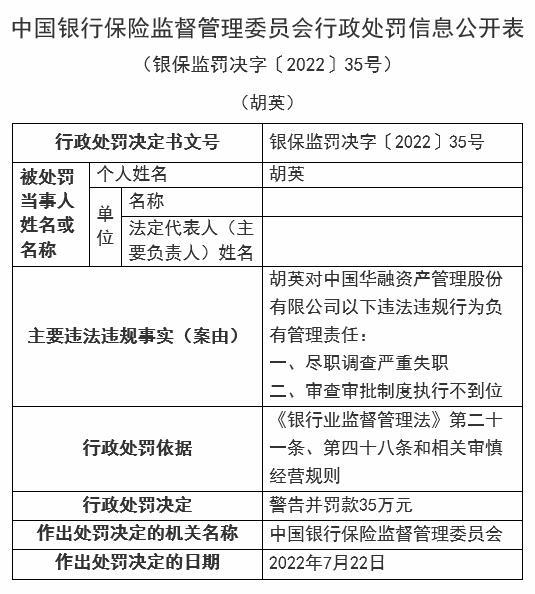 胡英对中国华融以下违法违规行为负有直接责任:一、尽职调查严重失职;二、审查审批制度执行不到位。中国银保监会依据《银行业监督管理法》第二十一条、第四十八条和相关审慎经营规则,对胡英警告并罚款35万元。