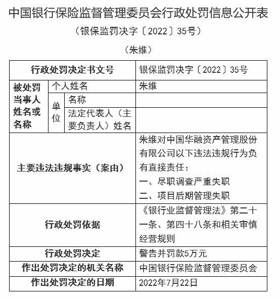 朱维中国华融以下违法违规行为负有直接责任:一、尽职调查严重失职;二、项目后期管理失职。中国银保监会依据《银行业监督管理法》第二十一条、第四十八条和相关审慎经营规则,对朱维警告并罚款5万元。
