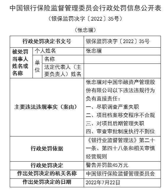 此外,张忠骥对中国华融以下违法违规行为负有直接责任:一、尽职调查严重失职;二、项目档案移交程序不合规;三、对项目后期管理失职;四、审查审批制度执行不到位。中国银保监会依据《银行业监督管理法》第二十一条、第四十八条和相关审慎经营规则,对张忠骥警告并罚款45万元。