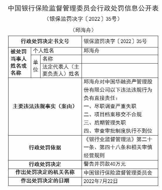 邱海舟对中国华融以下违法违规行为负有直接责任:一、尽职调查严重失职;二、项目档案移交不合规;三、后期管理失职;四、审查审批制度执行不到位。中国银保监会依据《银行业监督管理法》第二十一条、第四十八条和相关审慎经营规则,对邱海舟警告并罚款40万元。