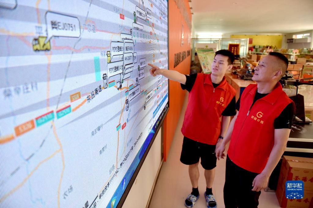 8月4日,王金武(右)和工作人员通过监控大屏查看物流车辆运行情况。