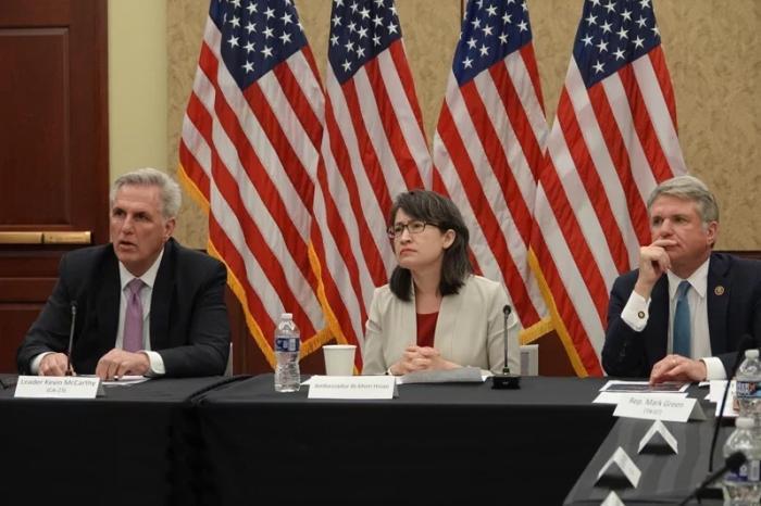 美东时间7月19日,美众院“中国工作小组”圆桌会议召开,左起为美众院共和党领袖麦卡锡、萧美琴、“中国工作小组”主席麦考尔。图片来源:台湾《联合报》记者 张文馨