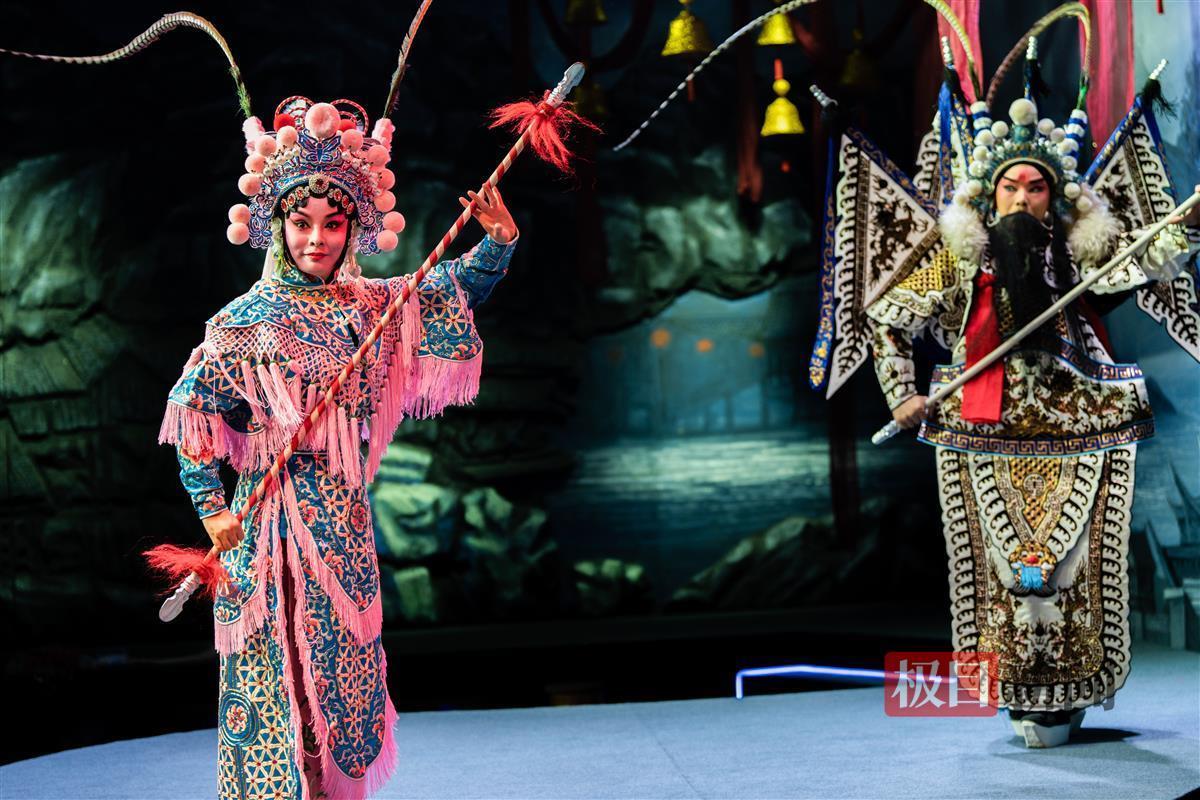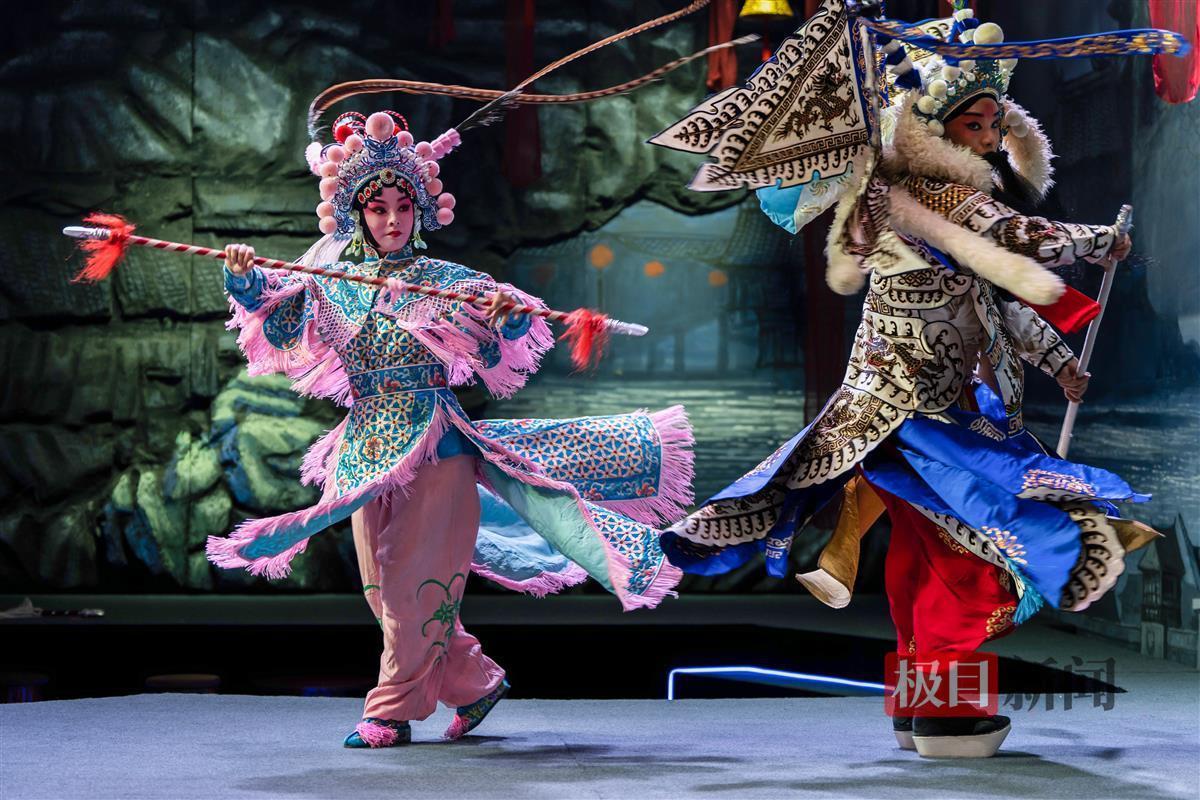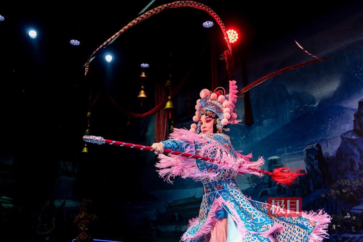 剧情中段,扈三娘与下山征讨扈家庄的王英对阵,两人缠斗不休,花枪与双刀就在观众面前交战,扈三娘手执花枪一个旋身,紧靠着台前就坐的观众甚至不自觉躲闪;