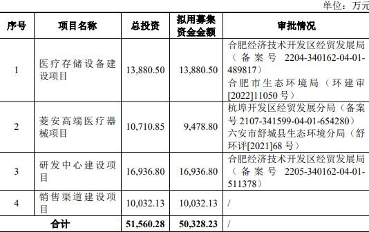 中科美菱拟募集资金5.03亿元,分别用于医疗存储设备建设项目、菱安高端医疗器械项目、研发中心建设项目、销售渠道建设项目。