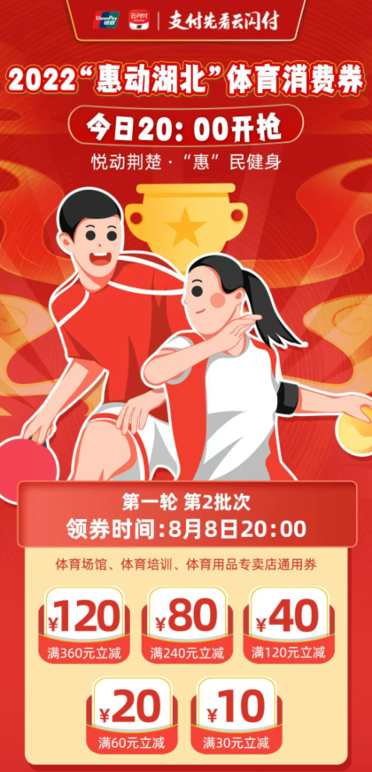 荆楚网(湖北日报网)讯(记者张扬)8月5日“惠游湖北”消费券刚来,今晚8点“惠动湖北”消费券又在赶来的路上了,你准备好了吗?8月8日至8月22日,“惠动湖北”体育消费券将面向全省17个市州的消费者(含外省在鄂人员)进行发放,每天20:00投放一次,共投放15次。