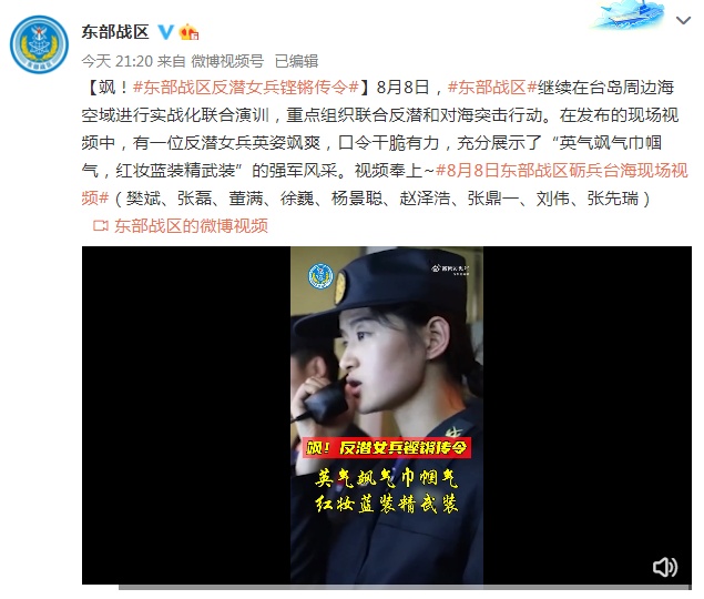 8月8日,东部战区继续在台岛周边海空域进行实战化联合演训,重点组织联合反潜和对海突击行动。在发布的现场视频中,有一位反潜女兵英姿飒爽,口令干脆有力,充分展示了“英气飒气巾帼气,红妆蓝装精武装”的强军风采。(樊斌、张磊、董满、徐巍、杨景聪、赵泽浩、张鼎一、刘伟、张先瑞)