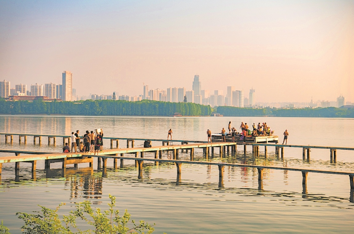 被淡淡晨雾笼罩着的东湖凌波门,迎来一群操着方言的武汉“老杆儿”,他们潇洒地拉着家常,自在地跃入湖水,换来一连串“来一个!精神!”的赞叹声。远处的天空投射出热烈又温柔的金色光芒,将此刻的美好凝固定格,这便是令人动容的“江城人间”。