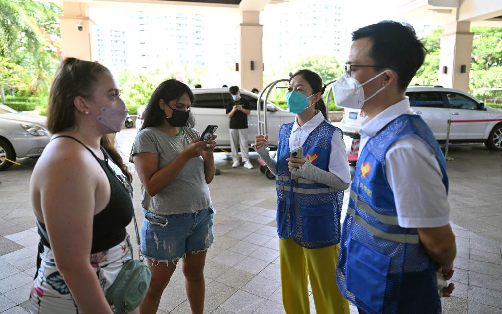三亚外籍游客向志愿者咨询相关防疫政策。 新华社记者 郭程 摄
