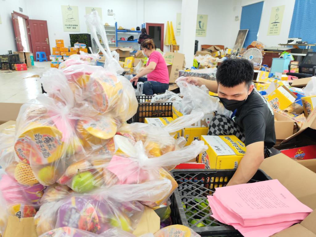 三亚农业投资集团有限公司仓储分拣中心内,工作人员正在分拣和打包“爱心包”,以便尽早送到滞留三亚的游客手中。新华社记者 郭程 摄