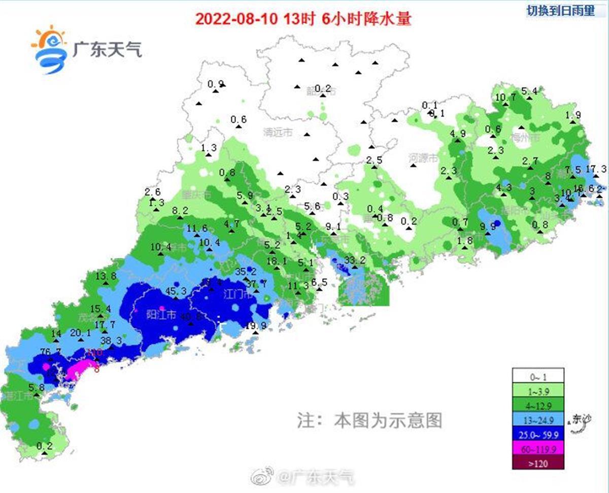 广东各地过去6小时降雨量(截至10日13时,图源:广东天气)