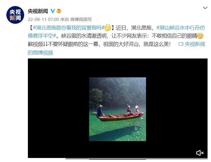 近日,湖北恩施,屏山峡谷水中行舟仿佛悬浮半空。峡谷里的水清澈透明,让不少网友表示:不敢相信自己的眼睛。不要怀疑眼前的这一幕,祖国的大好河山,就是这么美!