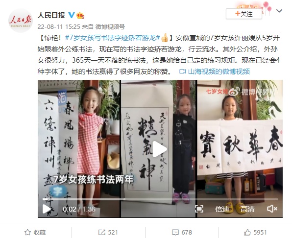 【惊艳!7岁女孩写书法字迹矫若游龙】安徽宣城的7岁女孩许丽媛从5岁开始跟着外公练书法,现在写的书法字迹矫若游龙,行云流水。其外公介绍,外孙女很努力,365天一天不落的练书法,这是她给自己定的练习规矩。现在已经会4种字体了,她的书法赢得了很多网友的称赞。