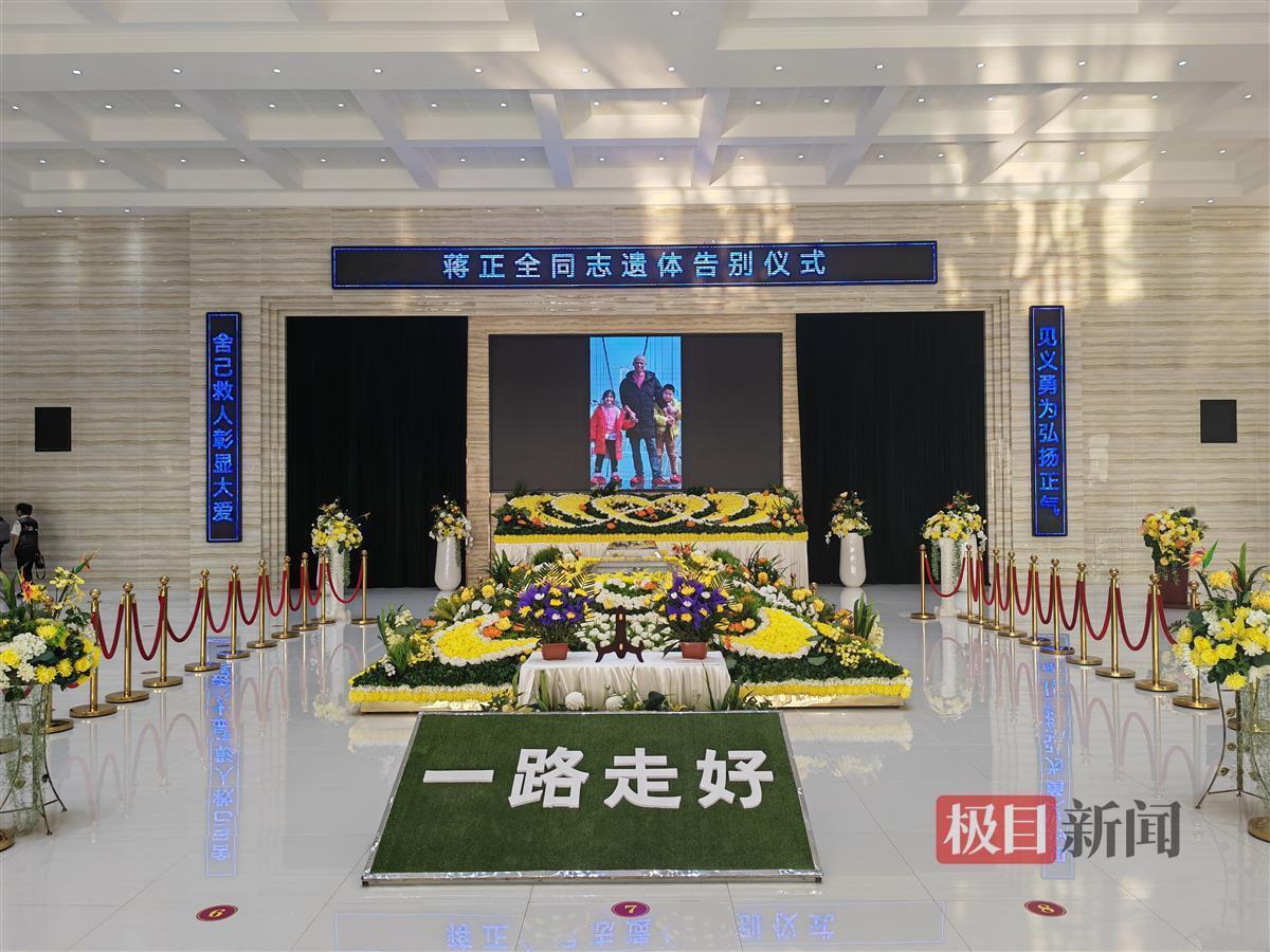 8月12日上午,蒋正全遗体告别仪式在他生前工作地陕西渭南举行。悼念厅中央,蒋正全的遗体被鲜花围拢,“见义勇为弘扬正气”“舍己救人彰显大爱”的挽联挂在大厅两侧,现场摆满了各界人士送来的花圈。在悼念厅的LED显示器上,则循环播放着蒋正全的生前照片。