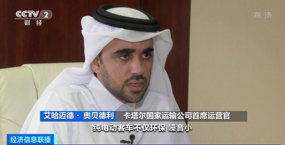 卡塔尔国家运输公司首席运营官 艾哈迈德· 奥贝德利:过去几个月,我们已经把一部分公交大巴替换成了纯电动客车。相比燃油客车,纯电动客车不仅环保、噪音小,而且保养维修方便,长期的经济效益也非常好。
