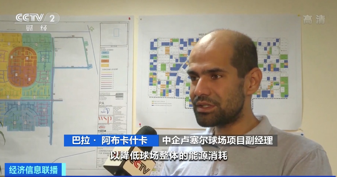中企卢塞尔球场项目副经理 巴拉· 阿布卡什卡:我们在球场建设过程中采用了很多工程技术,以降低球场整体的能源消耗。比如污水处理,我们通过抬高球场地基,利用重力作用来分离处理废水,无需使用单极水泵,这意味着更少的能源需求和运维需求。