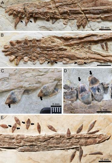 九佛堂组不同帆翼龙科牙齿形态类型。A-B:坎波斯凌源翼龙;C-D:中国帆翼龙;E:布氏努尔哈赤翼龙。 徐亦知 供图