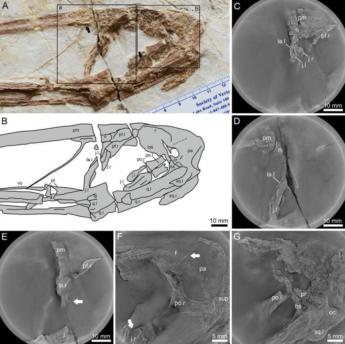 论文第一作者、中科院古脊椎所硕士研究生徐亦知介绍说,坎波斯凌源翼龙正型标本包含一亚成年个体的近完整头骨、下颌和寰枢椎,头骨长近31厘米。本次研究还使用平板计算机断层扫描(CT)技术,揭示出坎波斯凌源翼龙更多的解剖学信息:后部牙齿齿冠前后边缘具锋利的脊、下颌联合占下颌全长约1/4、轭骨眶后骨支具眼眶突、轭骨泪骨支长度超过鼻眶前孔高度的3/4、泪骨轭骨支长而尖锐。这些重要的解剖学形态特征,可以将坎波斯凌源翼龙与其他帆翼龙科成员相区别。此外,在之前的研究中,帆翼龙科通常被认为是一类不具有螺旋状颌关节的翼龙类,但此次研究观察发现努尔哈赤翼龙属成员及坎波斯凌源翼龙具有螺旋状颌关节。