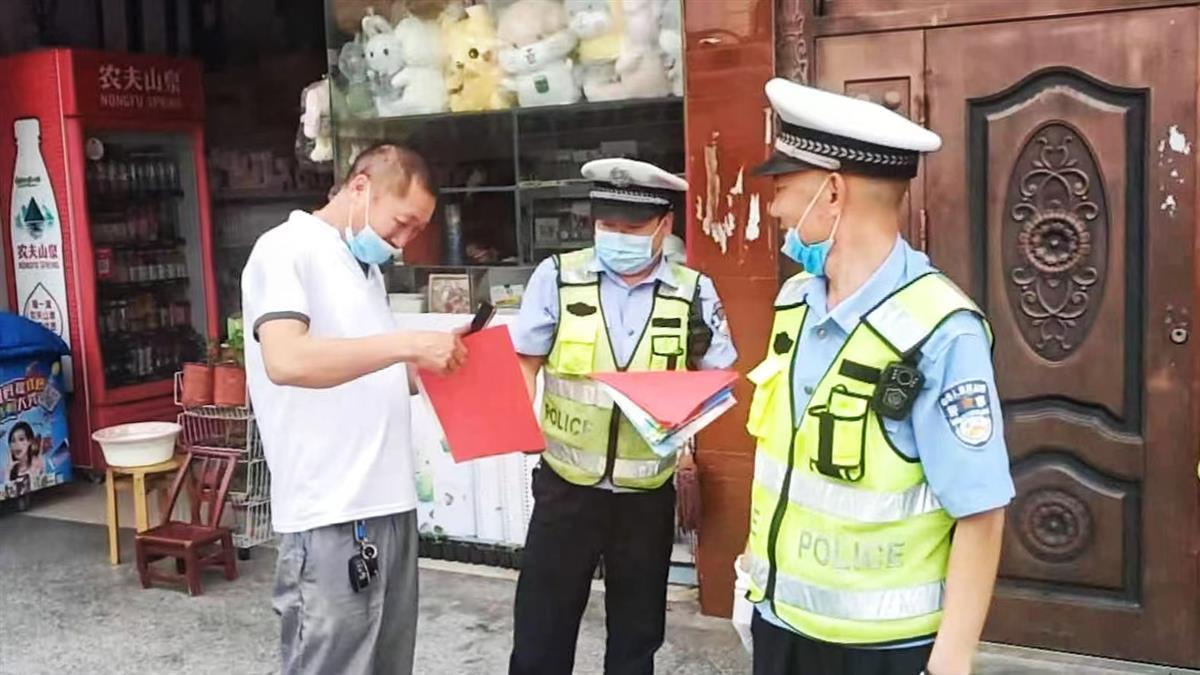 吴义君(中)沿街开展交通安全宣传