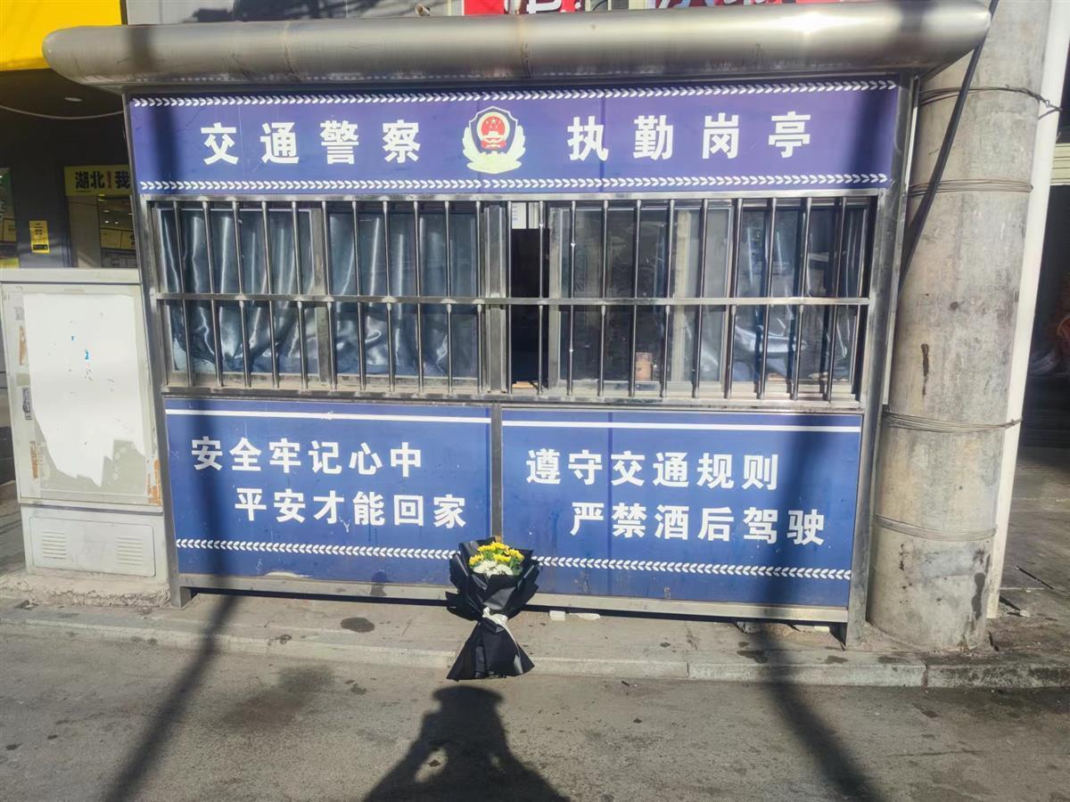 听闻吴义君因公牺牲,有市民来到他生前执勤的岗亭送上鲜花