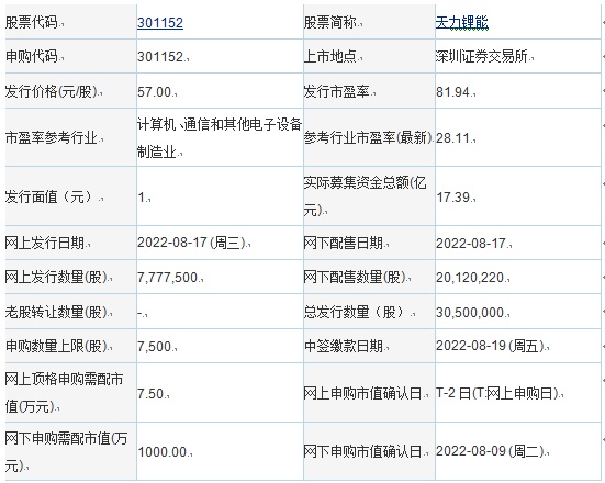 天力锂能2022年8月16日披露的首次公开发行股票并在创业板上市发行公告显示,公司本次募投项目预计使用募集资金83,645.66万元。按本次发行价格57.00元/股,预计公司募集资金总额为173,850万元,扣除预计发行费用约18,816.84万元(不含增值税)后,预计募集资金净额约为155,033.16万元。