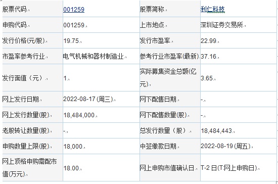 利仁科技2022年8月16日披露的首次公开发行股票发行公告显示,发行人本次募投项目拟投入募集资金金额为32,490.41万元,按本次发行价格19.75元/股、发行新股1,848.4443万股计算的预计募集资金总额为36,506.77万元,扣除发行费用4,016.36万元(不含增值税)后,预计募集资金净额为32,490.41万元。