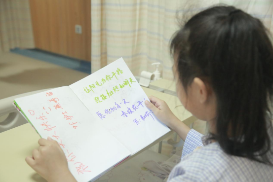 看到医护人员在画册上的留言,妍妍笑得很开心