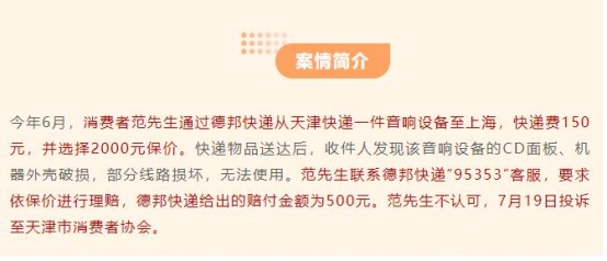 案情简介显示,今年6月,消费者范先生通过德邦快递从天津快递一件音响设备至上海,快递费150元,并选择2000元保价。快递物品送达后,收件人发现该音响设备的CD面板、机器外壳破损,部分线路损坏,无法使用。范先生联系德邦快递95353客服,要求依保价进行理赔,德邦快递给出的赔付金额为500元。范先生不认可,7月19日投诉至天津市消费者协会。