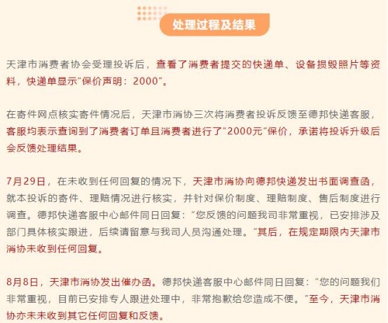 处理过程及结果显示,天津市消费者协会受理投诉后,查看了消费者提交的快递单、设备损毁照片等资料,快递单显示“保价声明:2000”。在寄件网点核实寄件情况后,天津市消协三次将消费者投诉反馈至德邦快递客服,客服均表示查询到了消费者订单且消费者进行了2000元保价,承诺将投诉升级后会反馈处理结果。