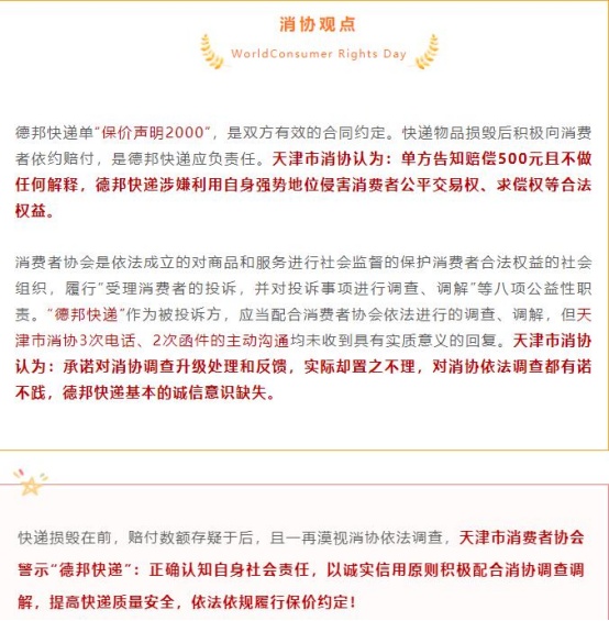 消费者协会认为,德邦快递单“保价声明2000”,是双方有效的合同约定。快递物品损毁后积极向消费者依约赔付,是德邦快递应负责任。天津市消协认为:单方告知赔偿500元且不做任何解释,德邦快递涉嫌利用自身强势地位侵害消费者公平交易权、求偿权等合法权益。