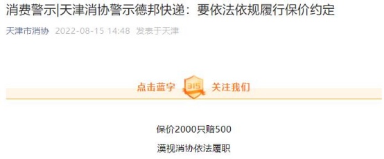 快递损毁在前,赔付数额存疑于后,且一再漠视消协依法调查,天津市消费者协会警示德邦快递:正确认知自身社会责任,以诚实信用原则积极配合消协调查调解,提高快递质量安全,依法依规履行保价约定。